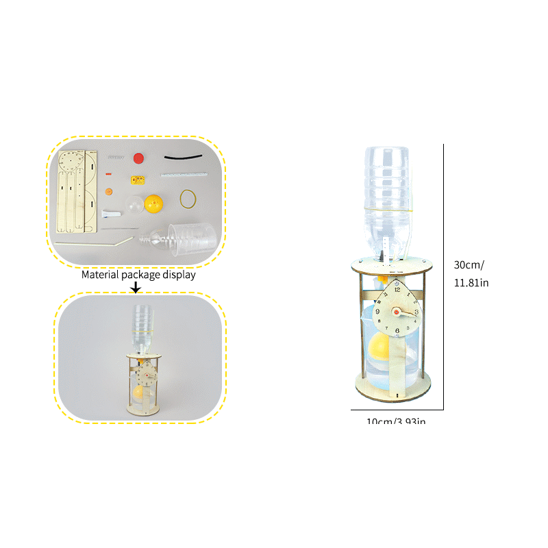 Gravedad: El reloj de gotas de agua se basa principalmente en el goteo lento de agua del recipiente bajo la influencia de la gravedad, y la medición del tiempo se logra controlando la velocidad de goteo de las gotas de agua. Por ejemplo, en un simple reloj de gotas de agua, el agua gotea de un recipiente en un punto alto a través de un pequeño agujero o tubo a una velocidad relativamente constante hasta el recipiente de abajo, y el paso del tiempo se juzga por el número de gotas de agua en una cierta cantidad de tiempo o el tiempo que tardan las gotas en llenar el recipiente de abajo.