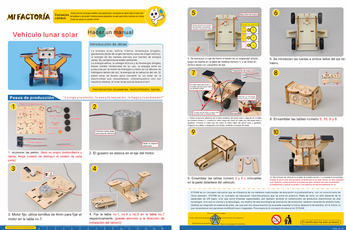 El diseño del rover es robusto y fácil de ensamblar, lo que lo convierte en una actividad educativa ideal para realizar en familia. Además, su funcionamiento no requiere baterías, lo que lo hace amigable con el medio ambiente.